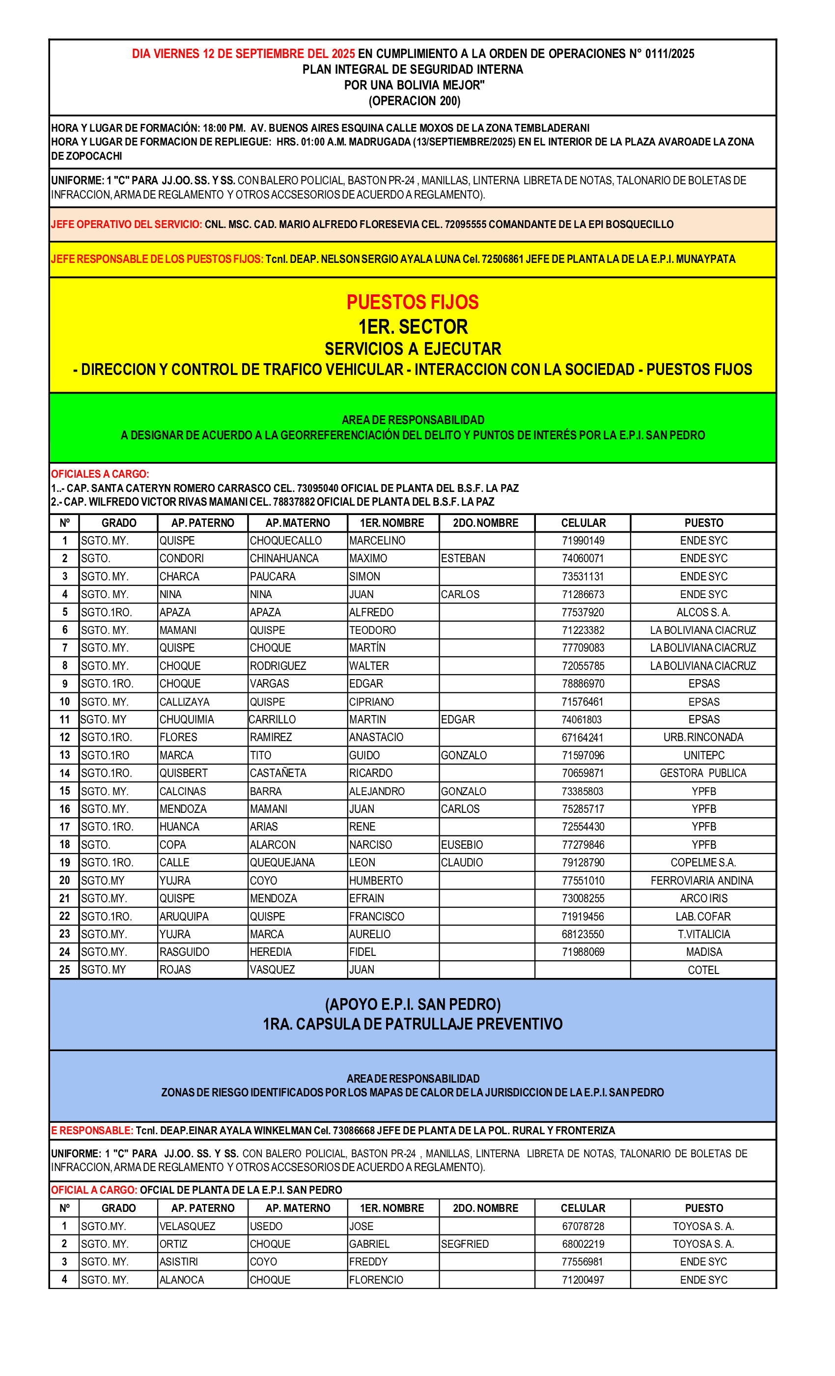 PLAN INTEGRAL DE SEGURIDAD INTERNA - VIERNES 12/09/2025 - OBSERVAR HORA, LUGAR DE FORMACION Y TIPO DE UNIFORME DEL SERVICIO