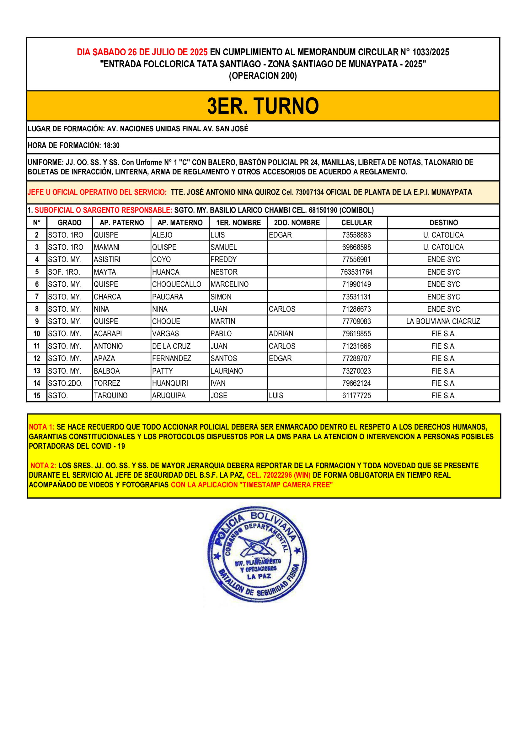 SERVICIO EXTRAORDINARIO "ENTRADA FOLKLORICA ZONA DE MUNAYPATA" - OBSERVAR LA HORA, LUGAR DE FORMACION Y TIPO DE UNIFORME PARA EL SERVICIO